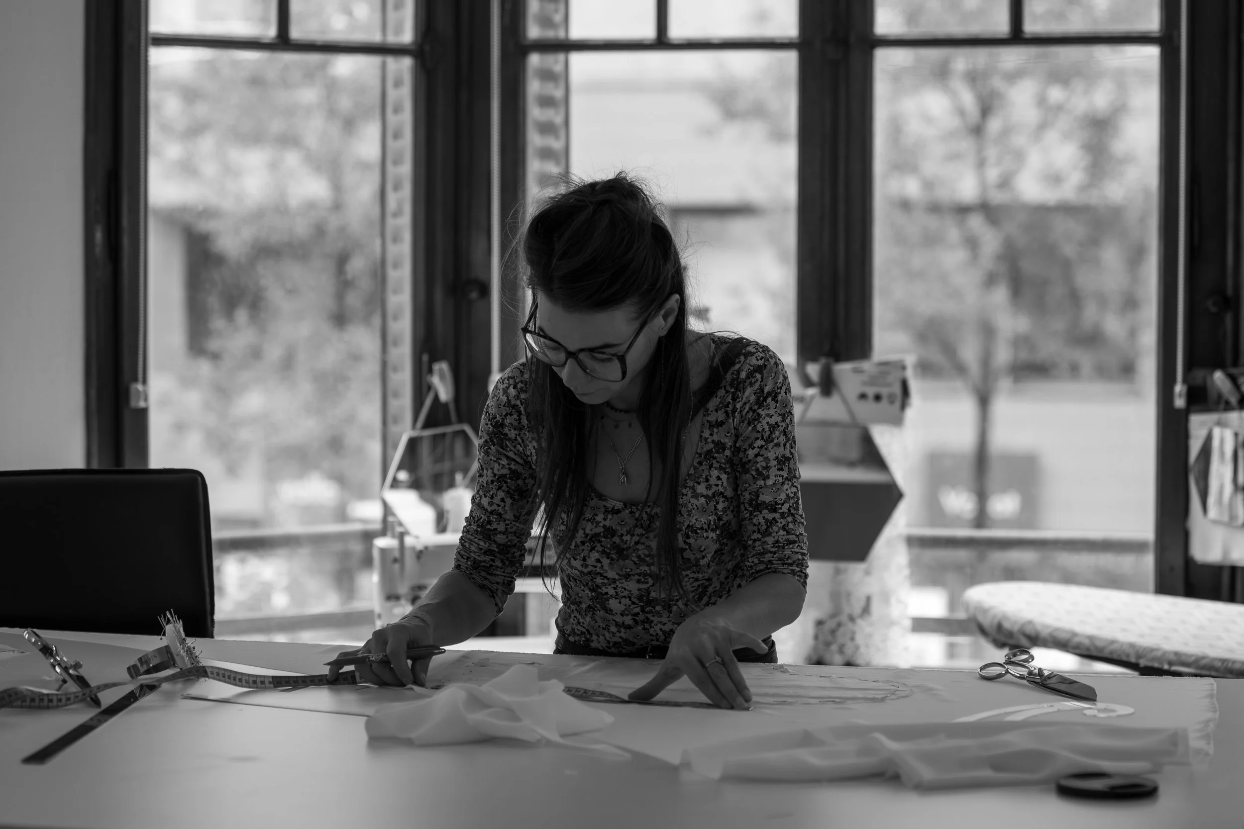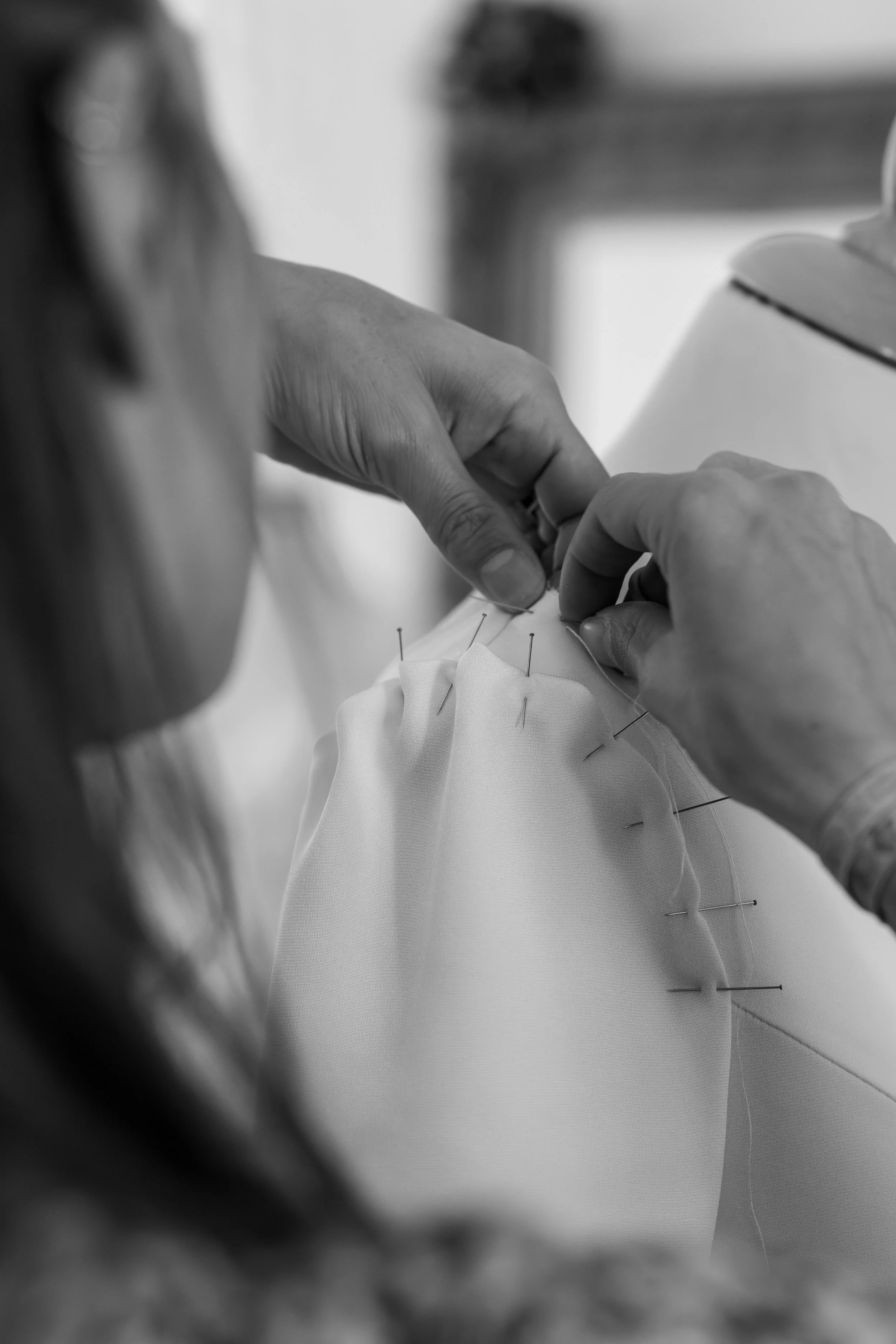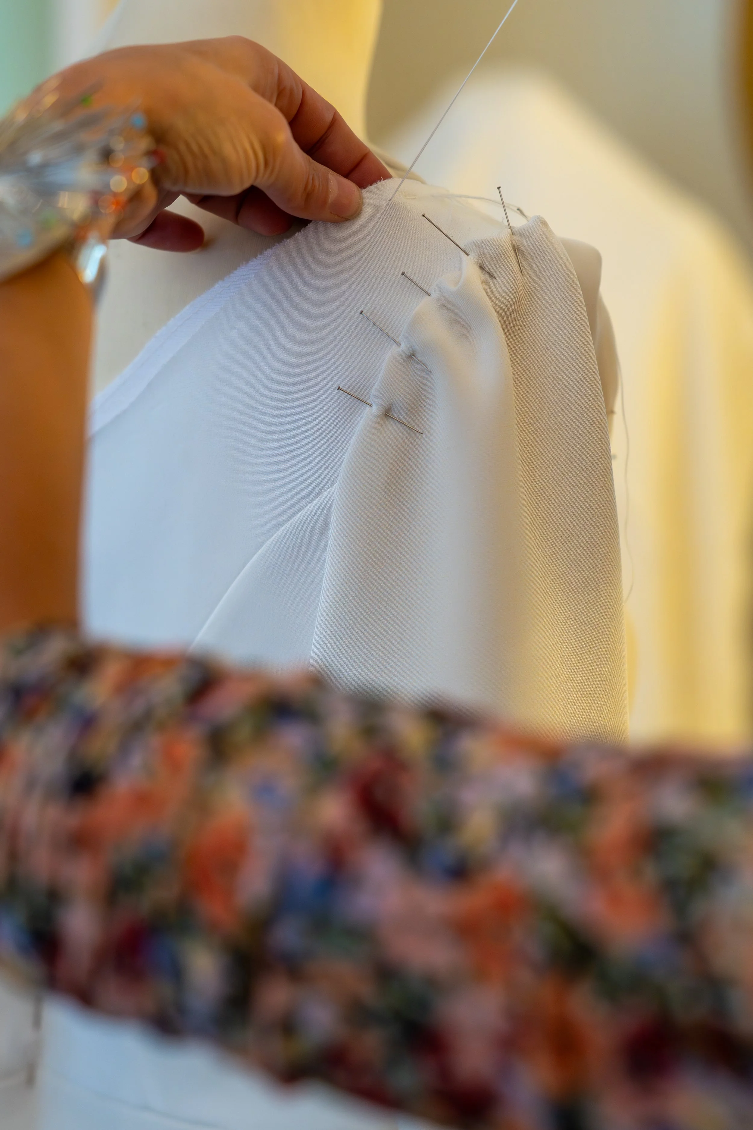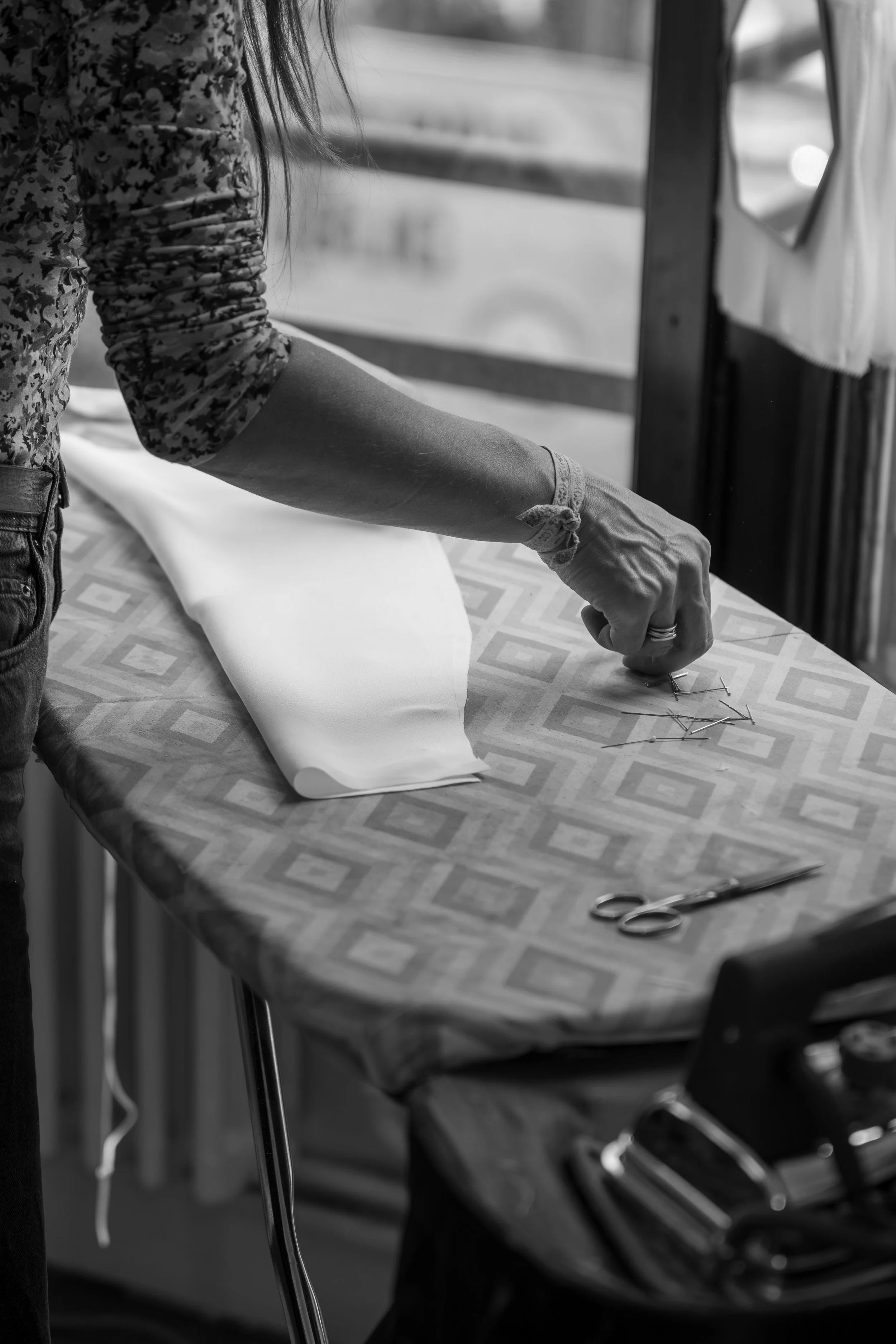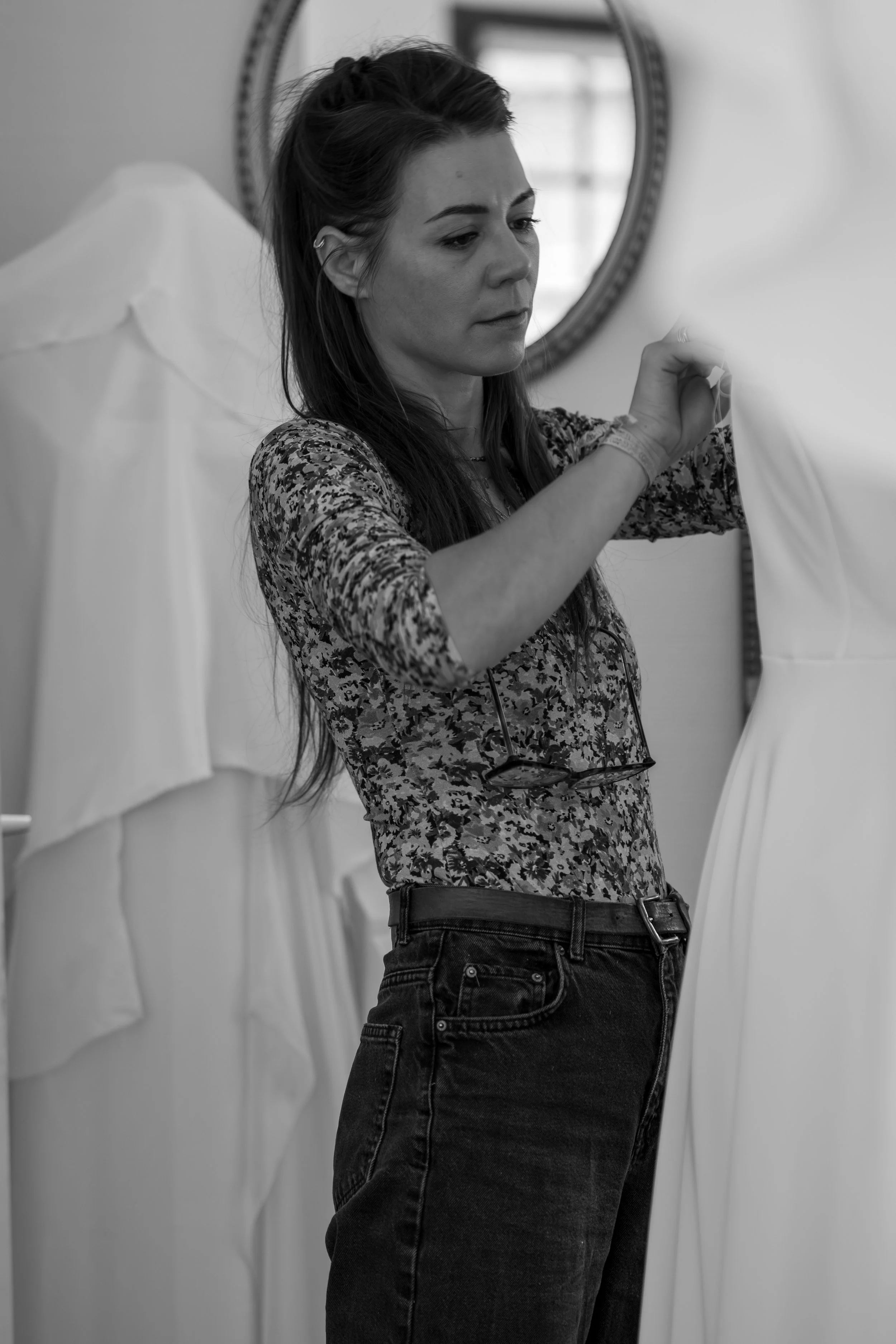 Anaïs accueille ses clientes avec écoute et bienveillance. Spécialiste de la couture sur-mesure, elle dessine, coupe, brode et ajuste chaque robe selon la morphologie, les goûts, les envies, mais aussi les rêveries. Le sur-mesure n’est pas juste une technique : c’est un accompagnement, une complicité entre la créatrice et la future mariée, une attention aux moindres détails — du choix des tissus aux finitions, jusqu’aux accessoires.