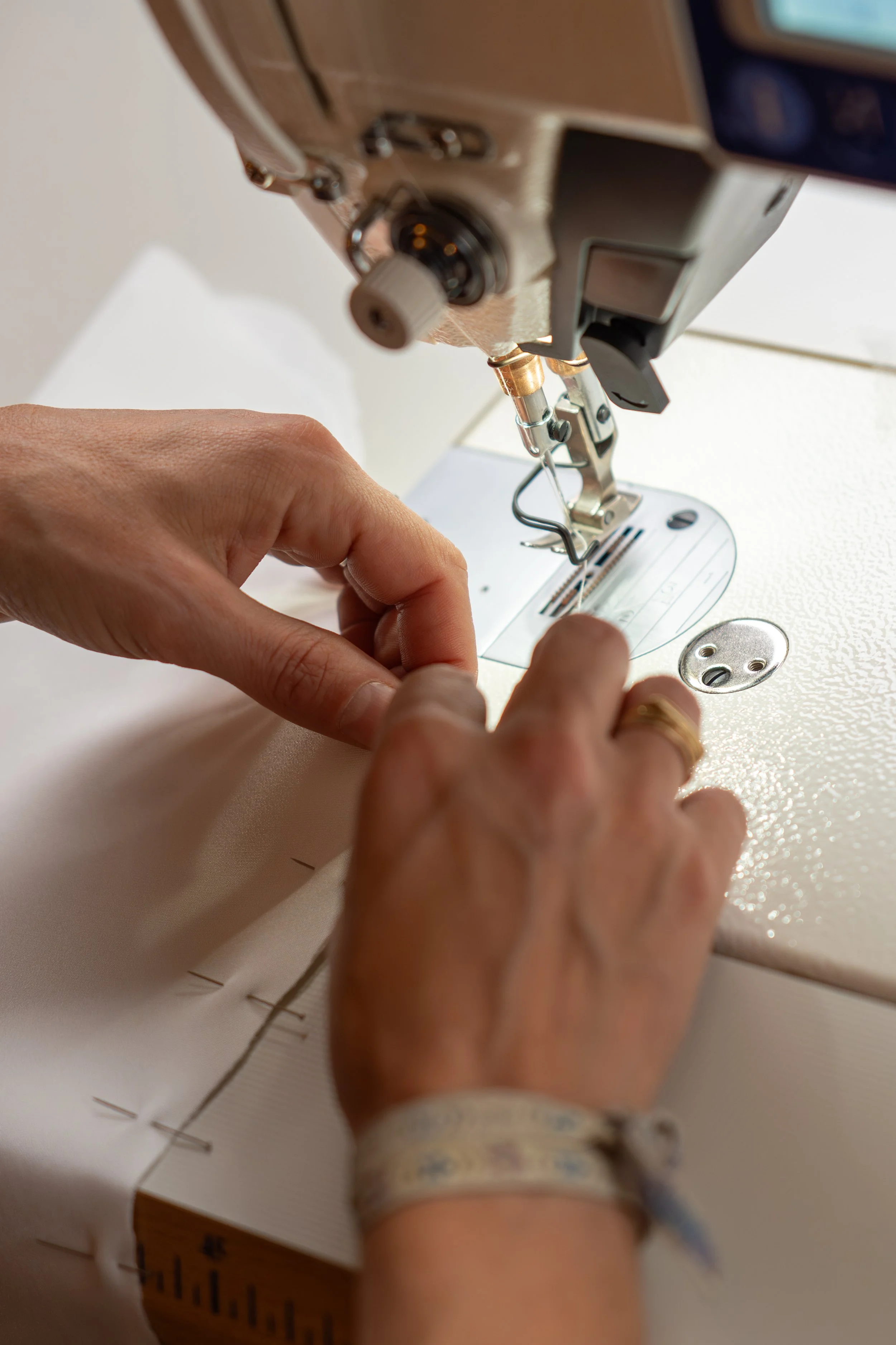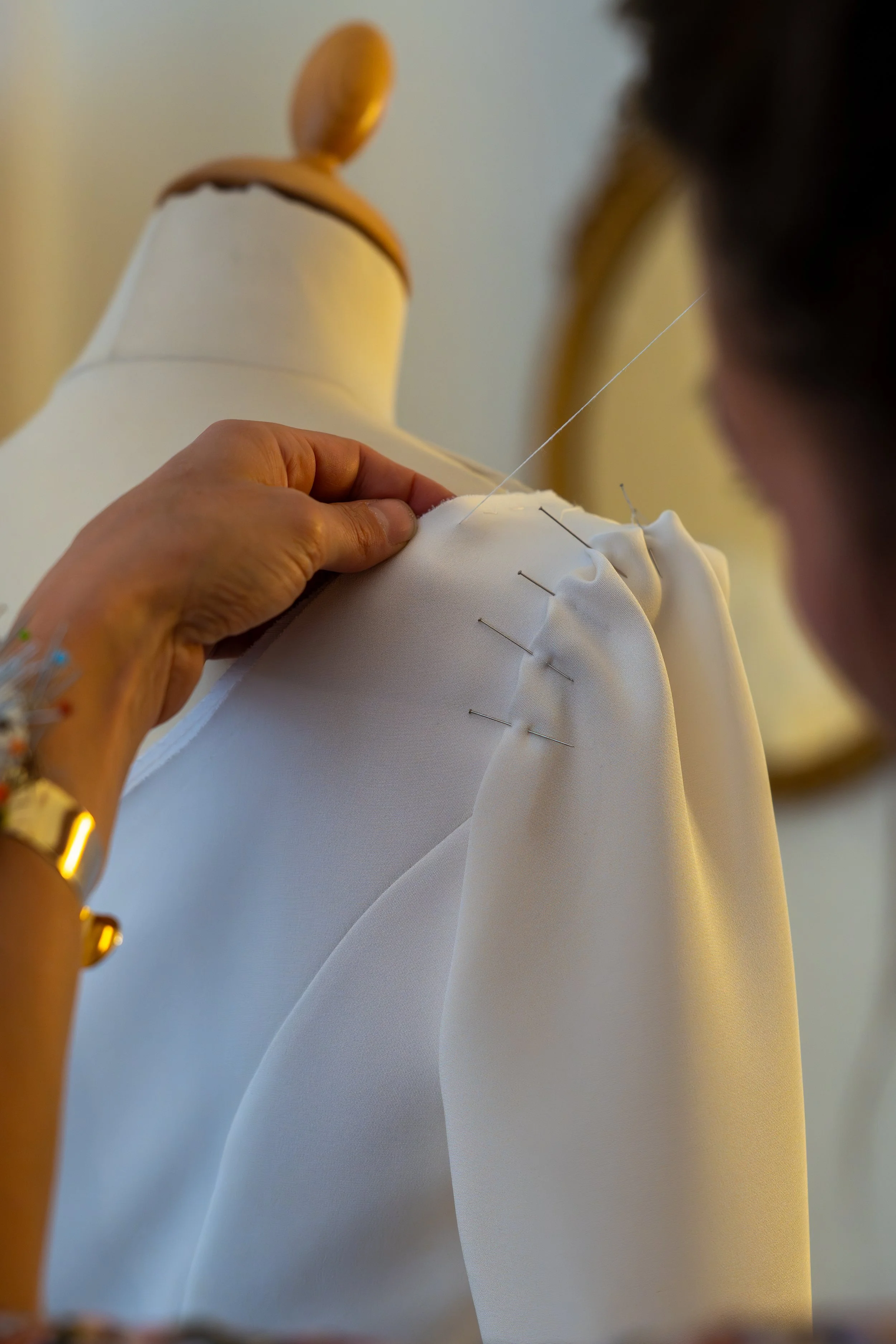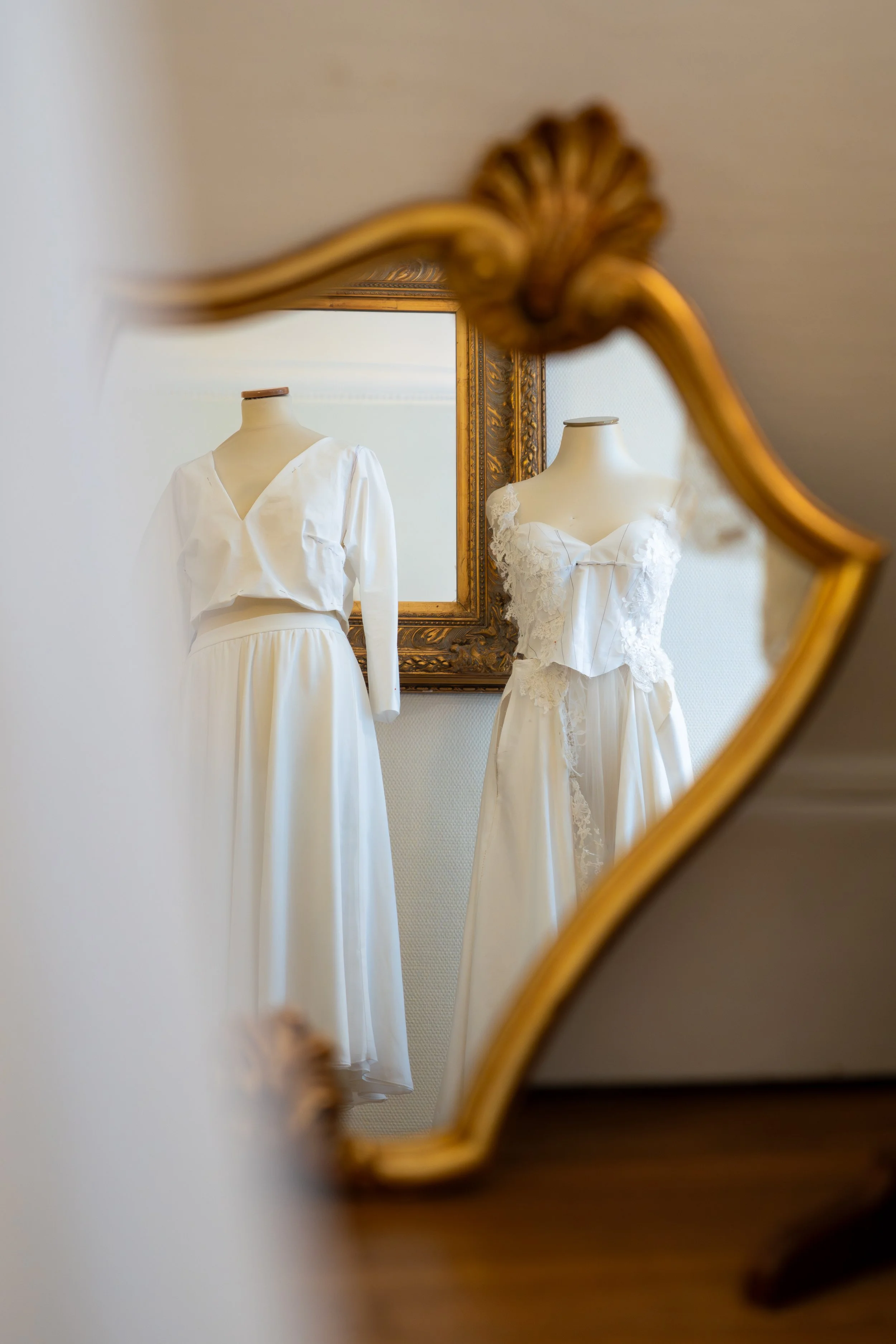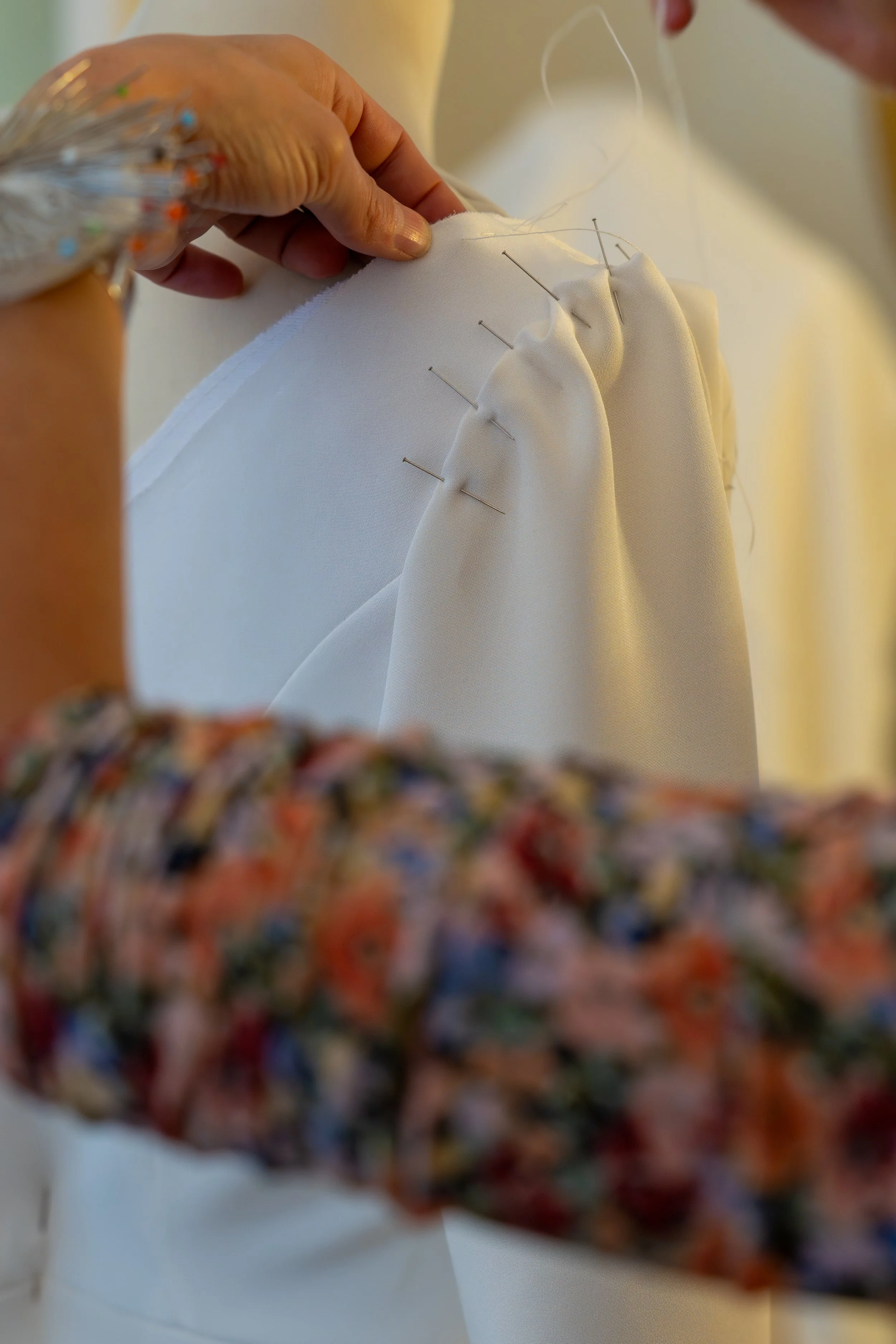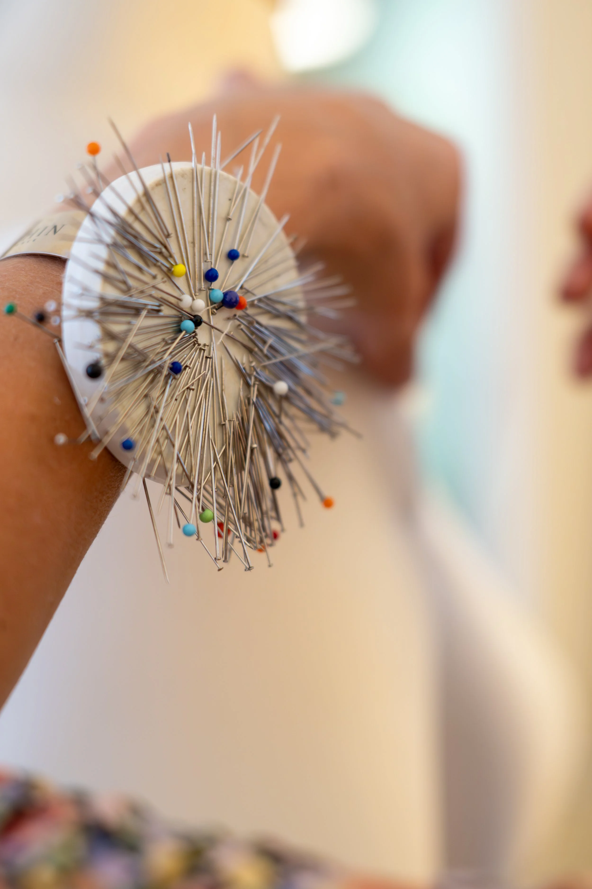 Anaïs accueille ses clientes avec écoute et bienveillance. Spécialiste de la couture sur-mesure, elle dessine, coupe, brode et ajuste chaque robe selon la morphologie, les goûts, les envies, mais aussi les rêveries. Le sur-mesure n’est pas juste une technique : c’est un accompagnement, une complicité entre la créatrice et la future mariée, une attention aux moindres détails — du choix des tissus aux finitions, jusqu’aux accessoires.