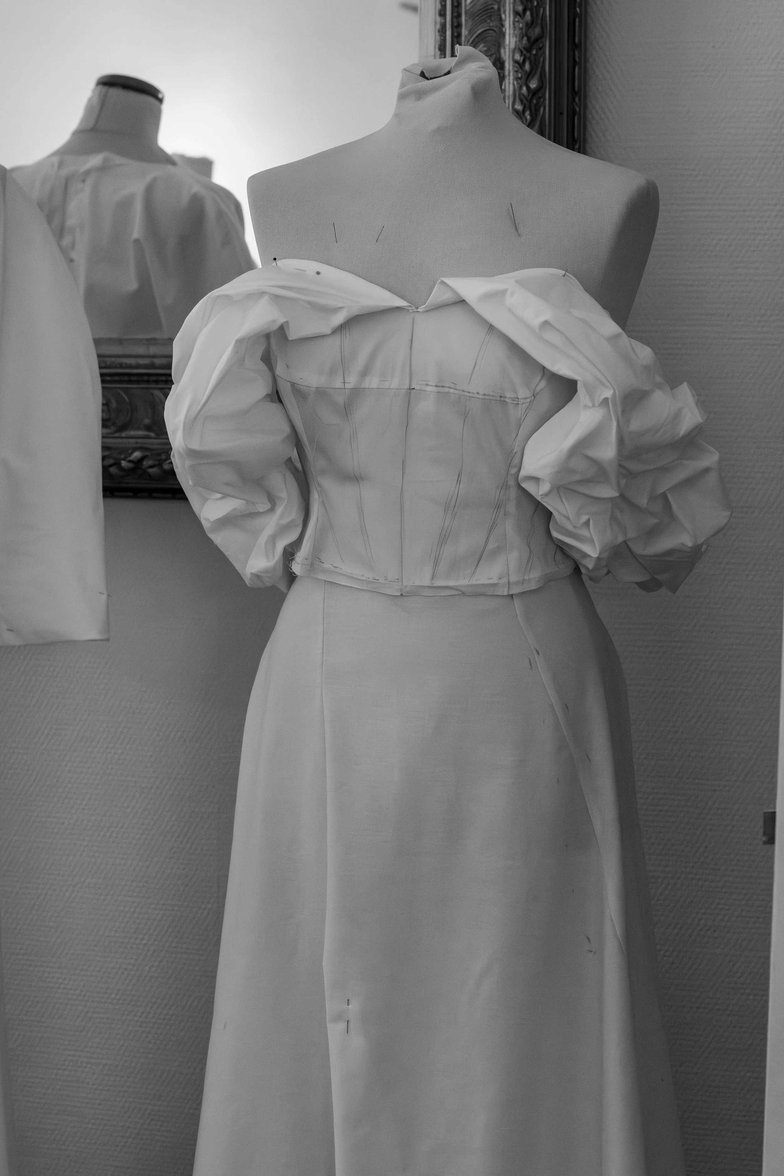 L’atelier se révèle comme un écrin intime : une lumière douce filtre par les fenêtres, mettant en valeur les étoffes et les dentelles qui attendent leur métamorphose. Le mobilier est sobre, souvent artisanal, les outils de couture traditionnels côtoient les pièces en cours de réalisation, ce qui donne à l’espace une atmosphère palpable de passion et de savoir-faire. On ressent silencieusement le bruit léger des ciseaux, le tissage des mains, l’attention portée à chaque point.